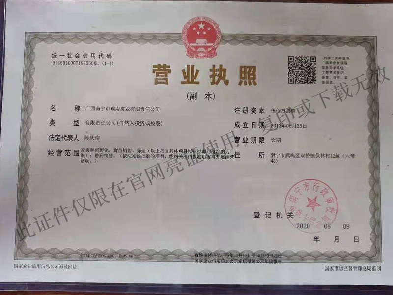 公司旧址位于广西首府南宁市安吉大道北永宁村,新址为武鸣双桥镇伏林村,占地43亩,投资建设有现代型公司孵化厂房面积8500㎡,全自动大型孵化器约500台,出壳机75台,员工100余人。目前公司资产总值超过1亿元,其中固定资产超过5000万元。如今每年可出苗4000万羽鸭苗,营业收入超过2亿元。瑞南禽业致力于打造集种鸭养殖、鸭苗孵化及销售、肉鸭养殖及销售为一体的现代型养殖+加工企业。